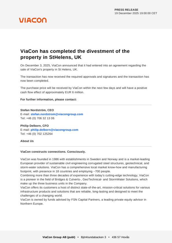 On December 3, 2025, ViaCon announced that it had entered into an agreement regarding the sale of ViaCon's property in St Helens, UK.