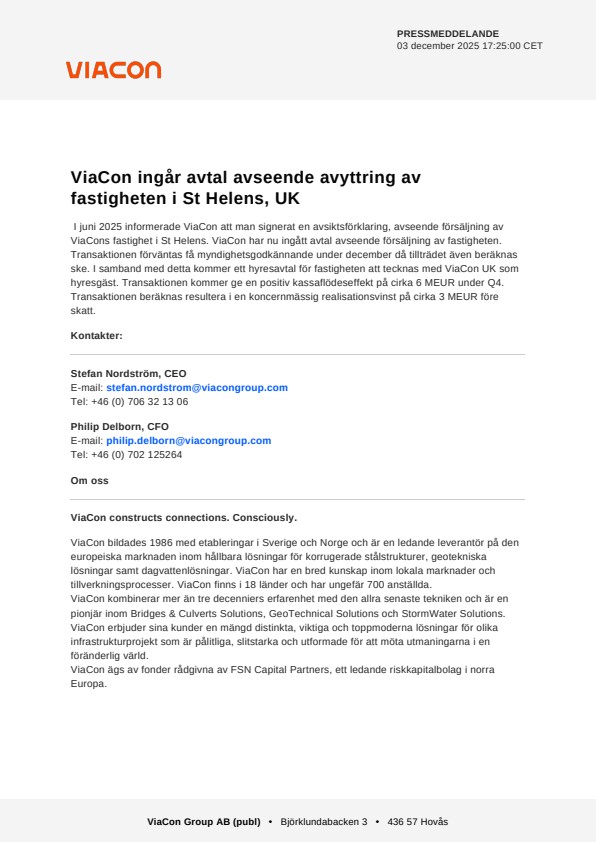 I juni 2025 informerade ViaCon att man signerat en avsiktsförklaring, avseende försäljning av ViaCons fastighet i St Helens. ViaCon har nu ingått avtal avseende försäljning av fastigheten. Transaktionen förväntas få myndighetsgodkännande under december då tillträdet även beräknas ske. I samband med detta kommer ett hyresavtal för fastigheten att tecknas med ViaCon UK som hyresgäst. Transaktionen kommer ge en positiv kassaflödeseffekt på cirka 6 MEUR under Q4. Transaktionen beräknas resultera i en koncernmässig realisationsvinst på cirka 3 MEUR före skatt.