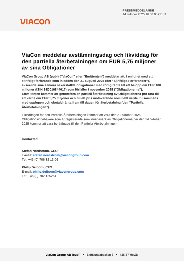 ViaCon Group AB (publ) (”ViaCon” eller ”Emittenten”) meddelar att, i enlighet med ett skriftligt förfarande som inleddes den 21 augusti 2025 (det ”Skriftliga Förfarandet”), avseende sina seniora säkerställda obligationer med rörlig ränta till ett belopp om EUR 100 miljoner (ISIN SE0016844617) som förfaller i november 2025 (”Obligationerna”), Emmitenten kommer att genomföra en partiell återbetalning av Obligationerna pro rata till ett värde om EUR 5,75 miljoner och till ett pris motsvarande nominellt värde, tillsammans med upplupen och obetald ränta fram till dagen för återbetalning (den ”Partiella Återbetalningen”).